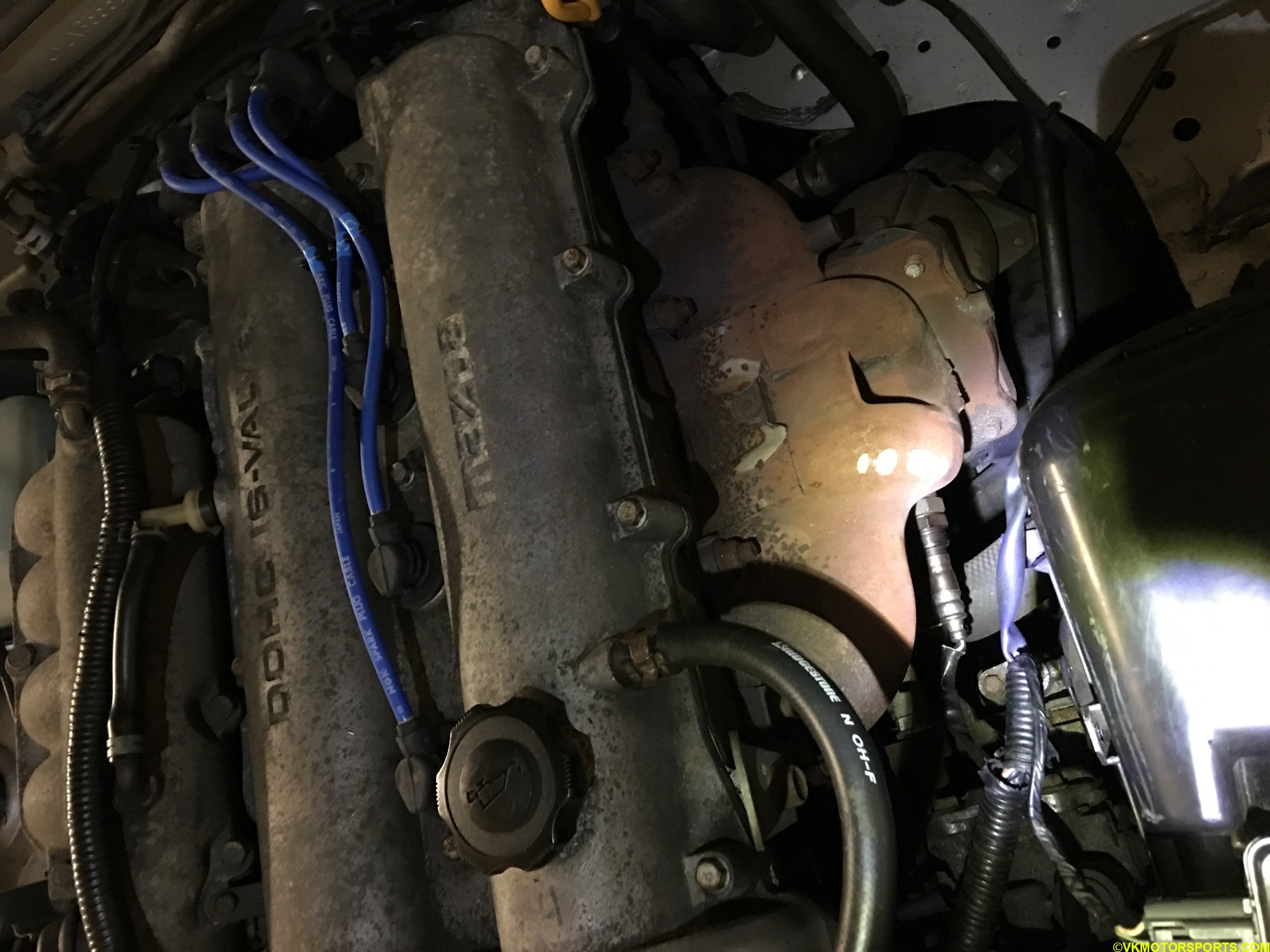 First locate if your car is California or Federal emissions by locating where the O2 sensors are. For the California emissions cars, the upstream (or front) sensor is in the header as seen in Figure 1, and the downstream (rear) sensor is in the exhaust pipe in the driver side wheel well (Figure 2) below the special upstream catalytic converter that’s below the header. In a Federal emissions car, the upstream sensor is the same as the downstream sensor from the California emissions car (in the wheel well), and the downstream sensor is after the main catalytic converter in the exhaust pipe. This post is about replacing the sensors in the California emissions sensors.