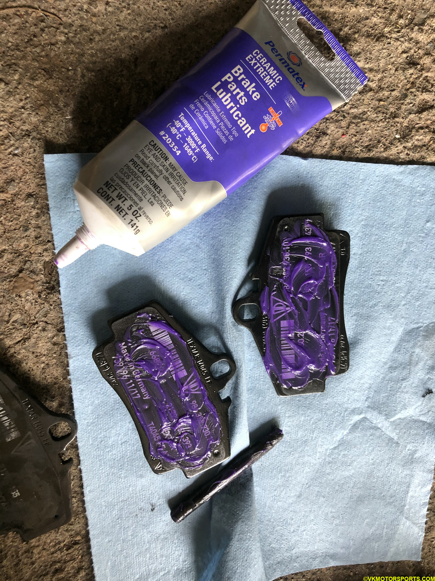 Step 10: Now take out the new brake pads from the packaging as seen in Figure 11. Look how thick they are compared to even the Miata’s new brake pads or a worn out Boxster brake pads! Using copper-based brake lubricant lubricate the non-friction side of the brake pads liberally and also lubricate the retaining pin that holds the pads together that you had removed in Step 6.